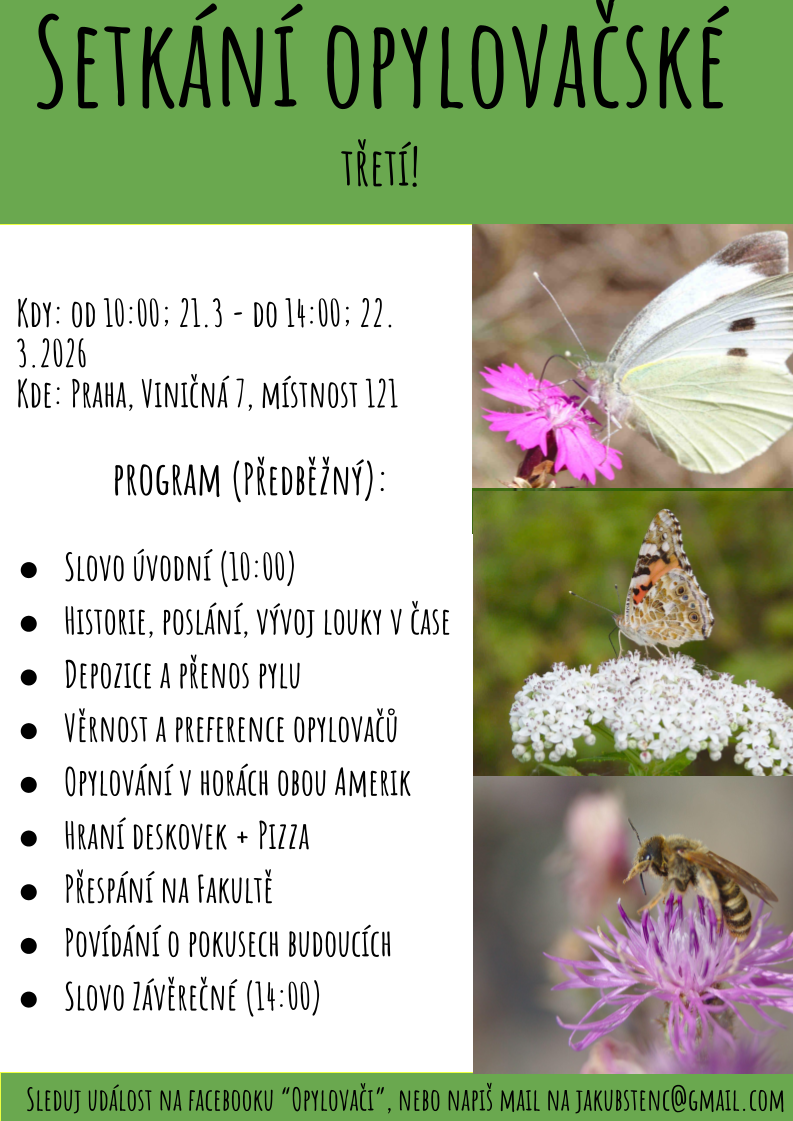 Výzkum opylovačů na louce k Handrkovu bude probíhat od 10. do 25. srpna, s “horkou fází” přibližně od 15. do 25. srpna, účastnit se lze na libovolně dlouhou podmnožinu času, jen je pro nás lepší vědět o účasti dopředu. Proto prosím doplňte své jméno do této tabulky (měla by jít upravovat, kdyby, tak napište). Tabulka není závazná a jde do ní určitě vyplnit i “možná”. Jde nám ale hlavně o získání přehledu ohledně možného nasazení lidských zdrojů na různé pokusy a jednak o nákup potravy a zajištění vody. A také prosím připojte poznámku o potravních omezeních prosím. Budeme na louce k Handrkovu (49.8463442N, 15.1504281E) u obce Vernýřov studovat interakce mezi hmyzem a rostlinami a to sérii pokusů, přičemž část jich poběží již třináctým rokem. Zajišťujeme stravu a dopravu z nejbližšího městečka (Uhlířské Janovice nebo Zbraslavice, záleží na směru příjezdu). Bydlíme přímo na louce pod velkou plachtou, vaříme společně na ohni a novinkou posledních let je malá solární sprcha se zástěnou. Byť jsou podmínky lehce spartánské, je to o to lepší zážitek (a můžeme díky tomu provádět pokusy hned od rána do večera, bez potřeby se přesouvat). Oceníme jakoukoliv pomoc a vše potřebné zaučíme! S sebou je pak potřeba jen oblečení, něco na hlavu (úpal je nejčastější problém), vlastní lahev na pití (vodu zajišťujeme centrálně, ale aby měl člověk jednu lahev pro vlastní spotřebu) a věci na spaní venku (od rybníka je občas lehce chladněji, tak je lepší být připraven). Obecně bereme i nějaké vidličky a misky na jídlo, ale pro zvýšenou schopnost kompetice doporučuji mít s sebou vidličku/lžičku, nůž a misku - občas je nás víc než vidliček a hůř se pak kompetuje (ale hlad nebývá).